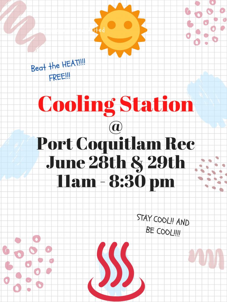 Cooling Station @ PoCo Rec Centre Beat the heat for free! June 28th & June 29th, use the cooling station at Port Coquitlam Rec centre. Available 11 AM – 8:30 PM.
