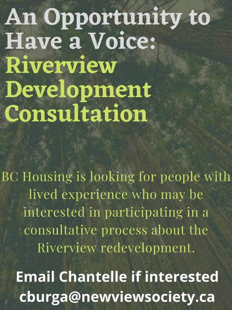 BC Housing is looking for people with lived experience who may be interested in participating in a consultative process about the Riverview development.